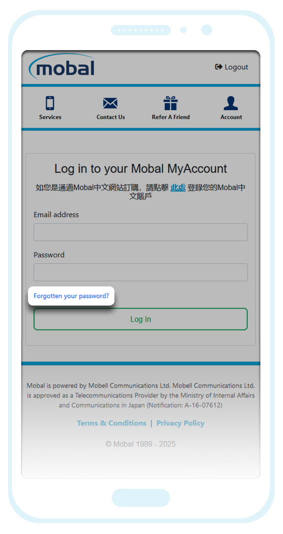 Please visit the login page www.mobal.com/myaccount and then click on the "Forgotten your password?" button highlighted below.