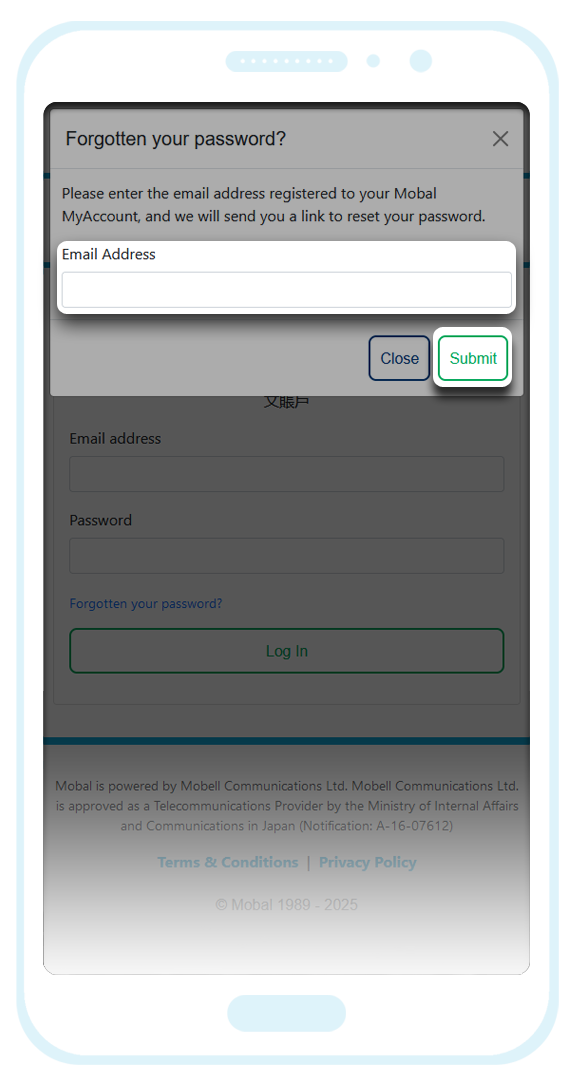 On the next screen, please enter your email address (this must be the email address that is currently linked to your Mobal account) and then click on the "Submit" button.