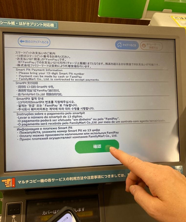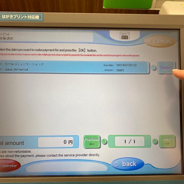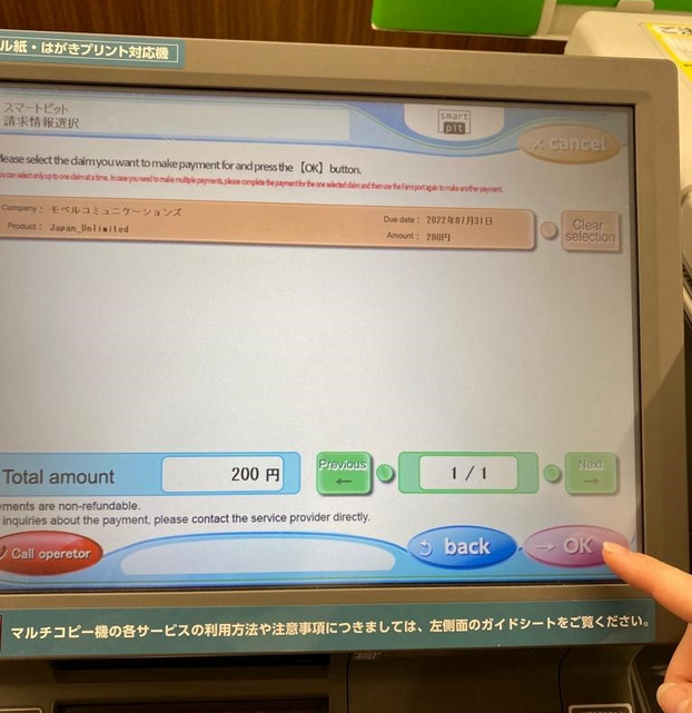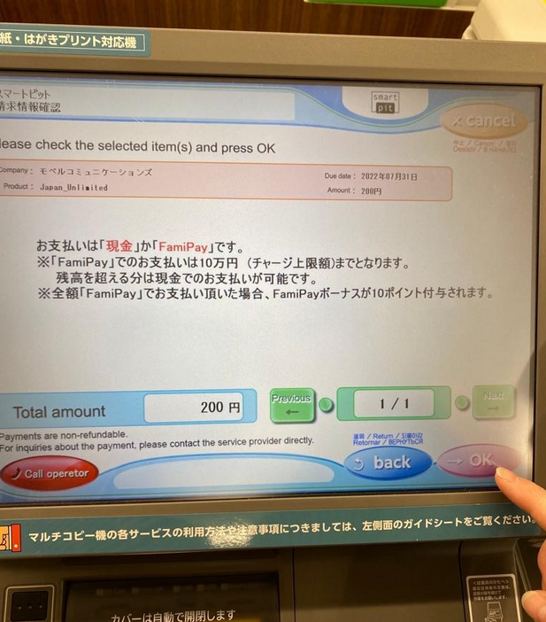 This screen just explains that payments must be made in cash or by means of "FamiPay". Users who choose to pay via "FamiPay" have a payment limit of 100,000 yen but you can pay any balance exceeding that amount in cash. For users who pay the full amount using "FamiPay", a bonus of 10 points is rewarded.
