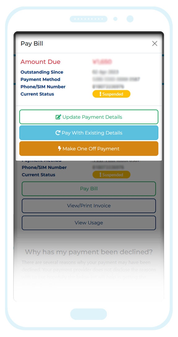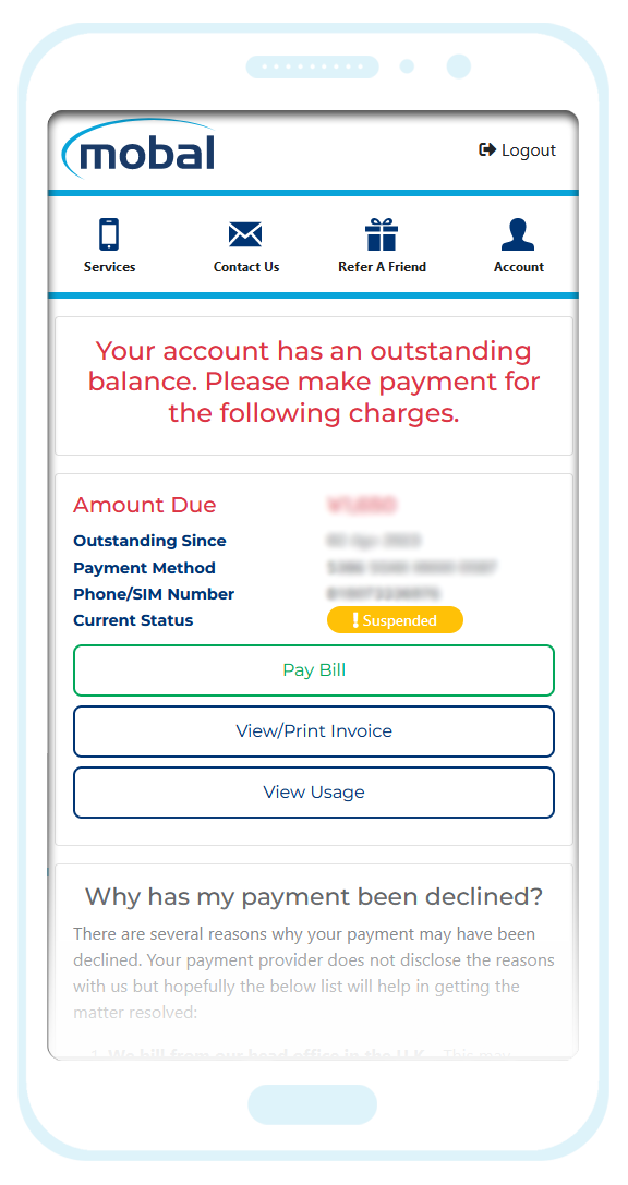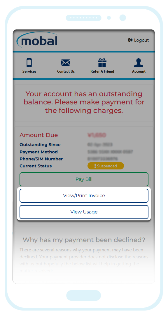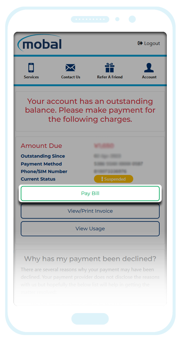 Once the declined charge has been resolved, you will also regain full access to your Mobal online account.