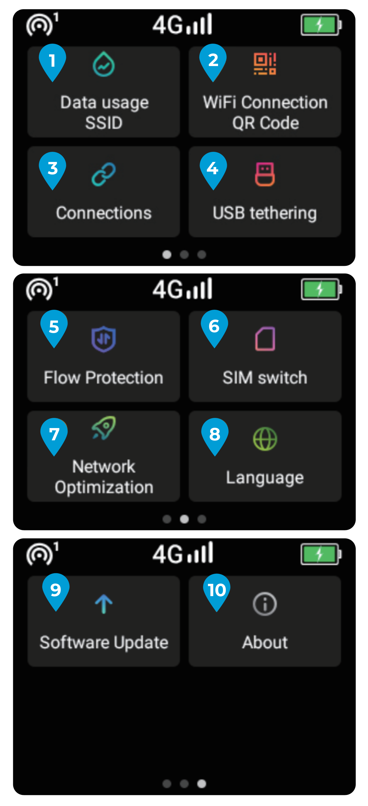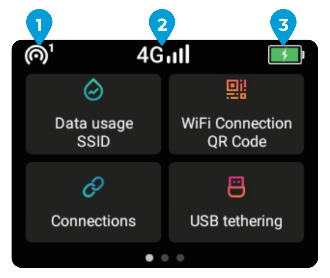 - Data Usage / SSID: Check your data usage, SSID and password