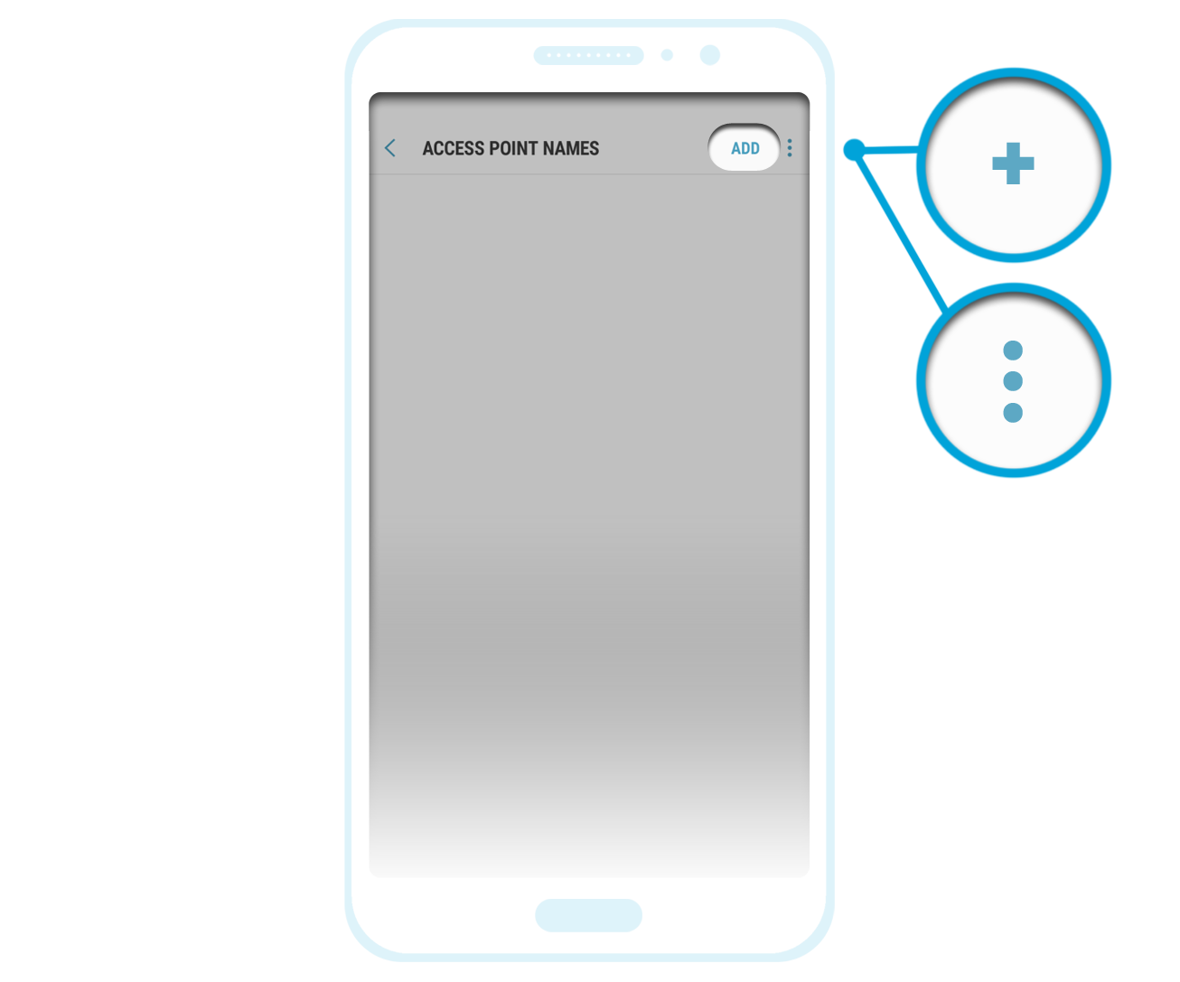 After reaching the "Access Point Names" section, you should then see a "+" symbol or the option to "Add" a new profile. Alternatively, you may see the 'Options' button (which usually appears as three dots) and after tapping this button, you will see the option to create a new profile.