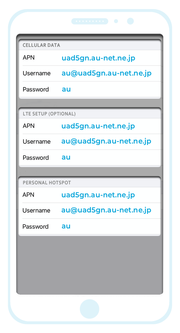 Once you have located this section, please enter the APN, Username and Password in the "Cellular Data" (or "Mobile Data") section, the "LTE Setup" section and the "Personal Hotspot" section as shown in the example below -